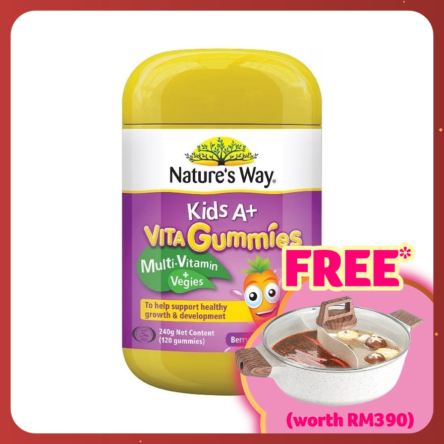 Kids need a complete-balanced nutrition to grow and prevent illness. But food today may not be sufficient in nutrition due to commercial growing techniques. Hence, supplements have become a necessity and not a luxury for your kids. Nature’s Way KA+ Multi + Veggies gummies is fortified with 8 types of vitamin and 5 types of veggies. Now you can be assured your kids are protected against nutrient deficiency that may prevent them from reaching their full growth potential. Benefits of key nutrients: -Protect against nutrient deficiency. -Promote full potential growth in kids. -Prevent on-set of diseases and illnesses due to nutrient deficiency. -Promote healthier kids with less sickness. -Benefits of various nutrients in each gummy a) Vitamin A is essential for the functioning of the eye b) Vitamin B12 is needed for red blood cell production c) Vitamin C contribute to the absorption of iron from food d) Vitamin D helps the body utilize Calcium and Phosphorus e) Vitamin E protects the fat in body tissues from oxidation f) With Veggies (Artichoke flower, Carrot, Beetroot, Spinach) contains phytonutrients Benefits: - Each gummy contains 8 types of vitamin and 5 types of veggies to promote a nutritionally balanced diet. - Delicious berries flavored gummy that kids love to eat. - No. 1 Best-selling Gummy brand from Australia. - Affordable, convenient, and time-saving solution for daily use.