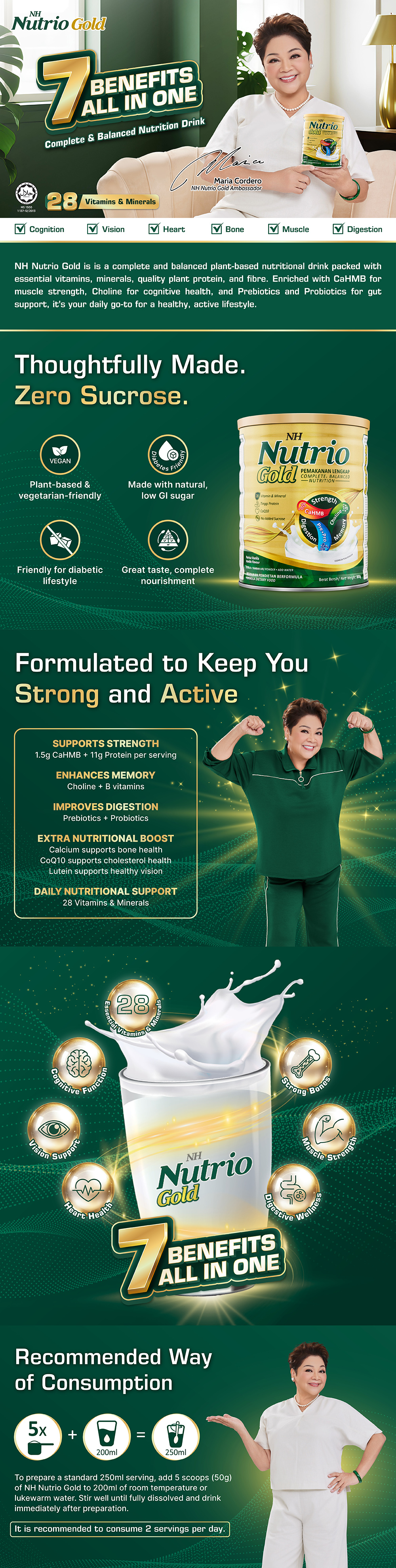 NH Nutrio Gold is a complete and balanced, plant-based nutritional drink, thoughtfully formulated to support your healthy, active lifestyle. Each serving delivers a rich blend of essential vitamins and minerals, high-quality plant protein, and digestion-boosting dietary fibre. Enriched with CaHMB to help build muscle tissue for better strength and Choline to support cognitive health, whether you are looking for a daily nutritional boost or simply aiming to elevate your overall wellness!