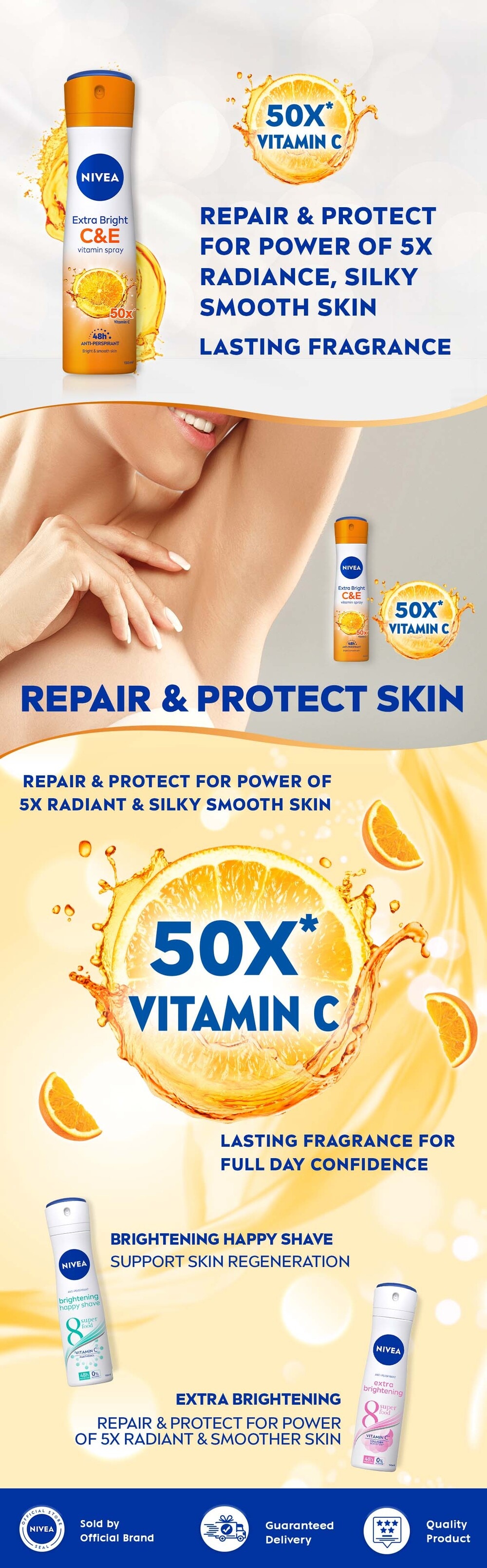 NIVEA Extra Bright C&E Deodorant with power of 5X Radiance contains of 50X Vitamin C gives you brighter underarms in 5 days white radiant and silky smooth skin with lasting fragrance for all day long that makes you will feel amazingly confident and beautiful all day long