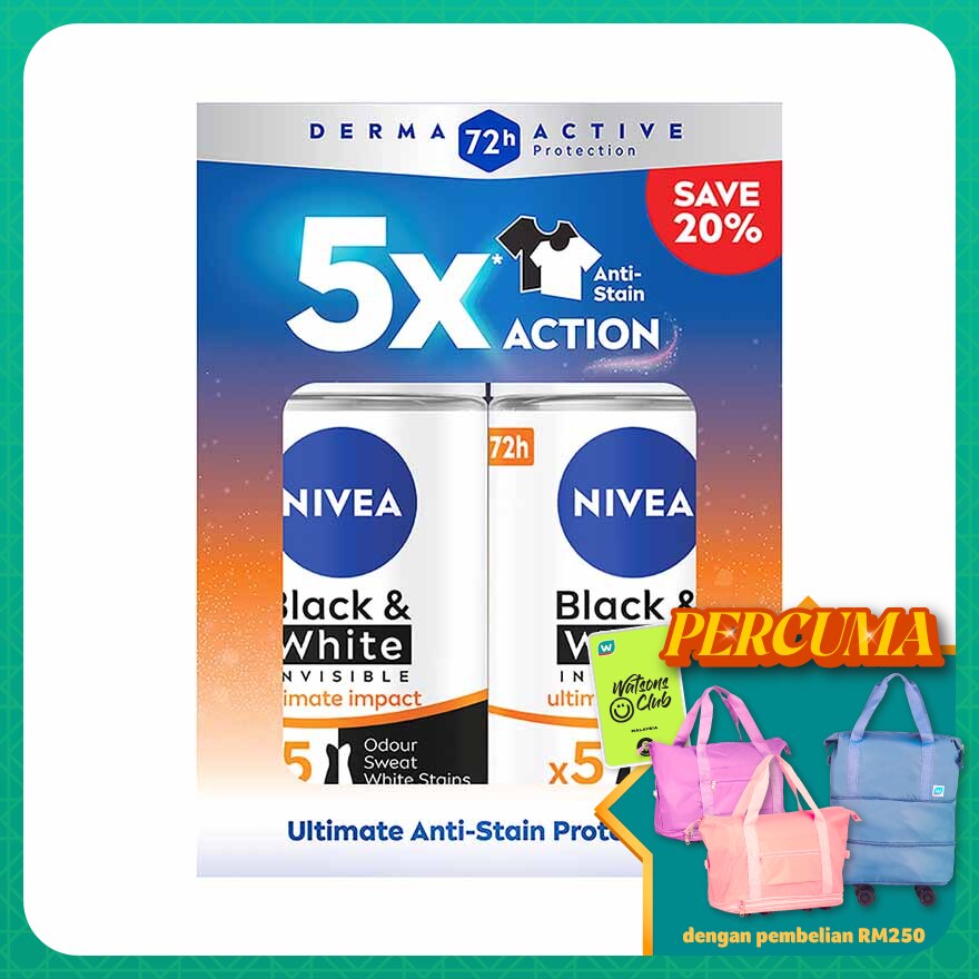 NIVEA Black & White Ultimate Impact Deodorant with 5 in 1 protection of anti-sweat, anti-stain, anti-odor, anti-residues and anti-irritation that provides silky smooth skin and lasting fine fragrance. Reliable 48h anti-perspirant protection that cares for your skin