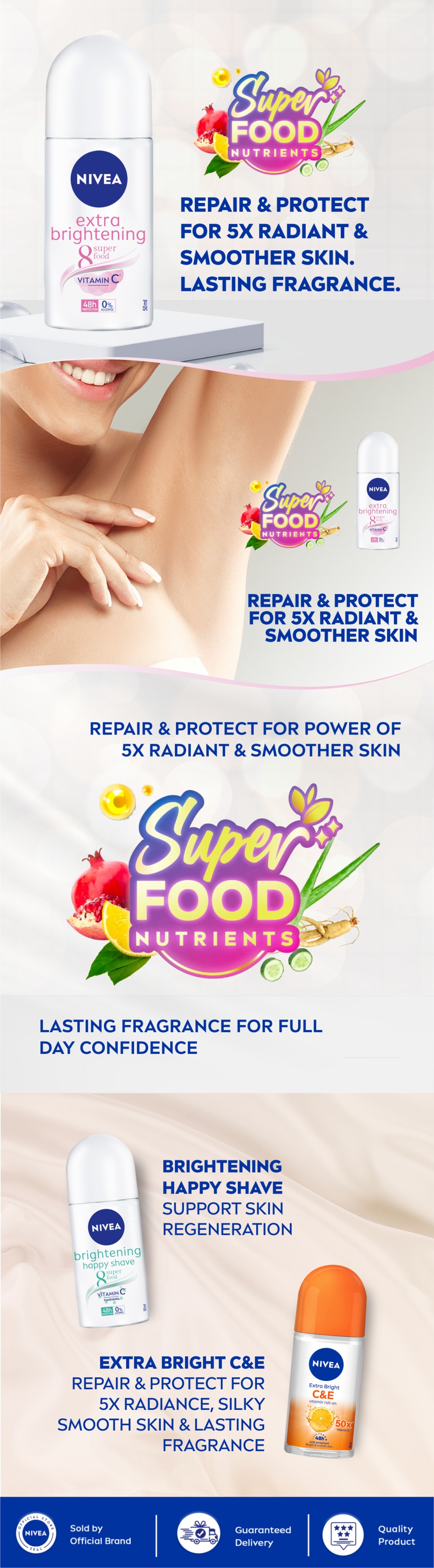 NIVEA DEODORANT EXTRA WHITENING enriched with 10 skin nutrients to nourish, repair and whiten underarm skin. The optimal combination of reliability, beauty, and care.