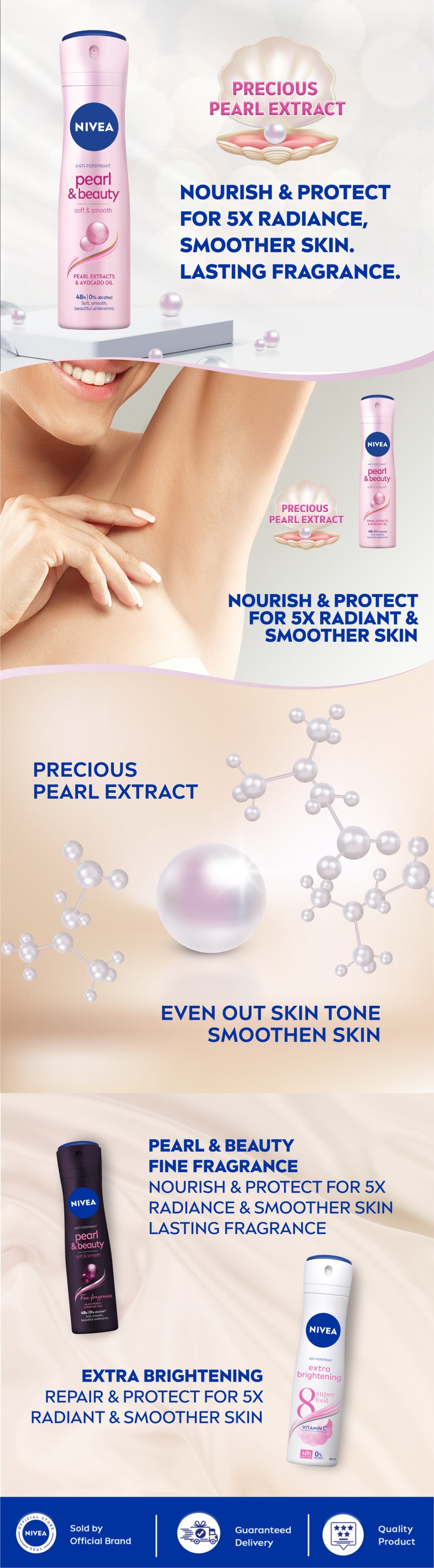 NIVEA Pearl & Beauty Deodorant – for beautiful, smooth underarms. Together with NIVEA’s 48-hour protection against underarm wetness and odour, its caring formula with precious pearl extracts leaves underarms feeling soft and looking beautiful.