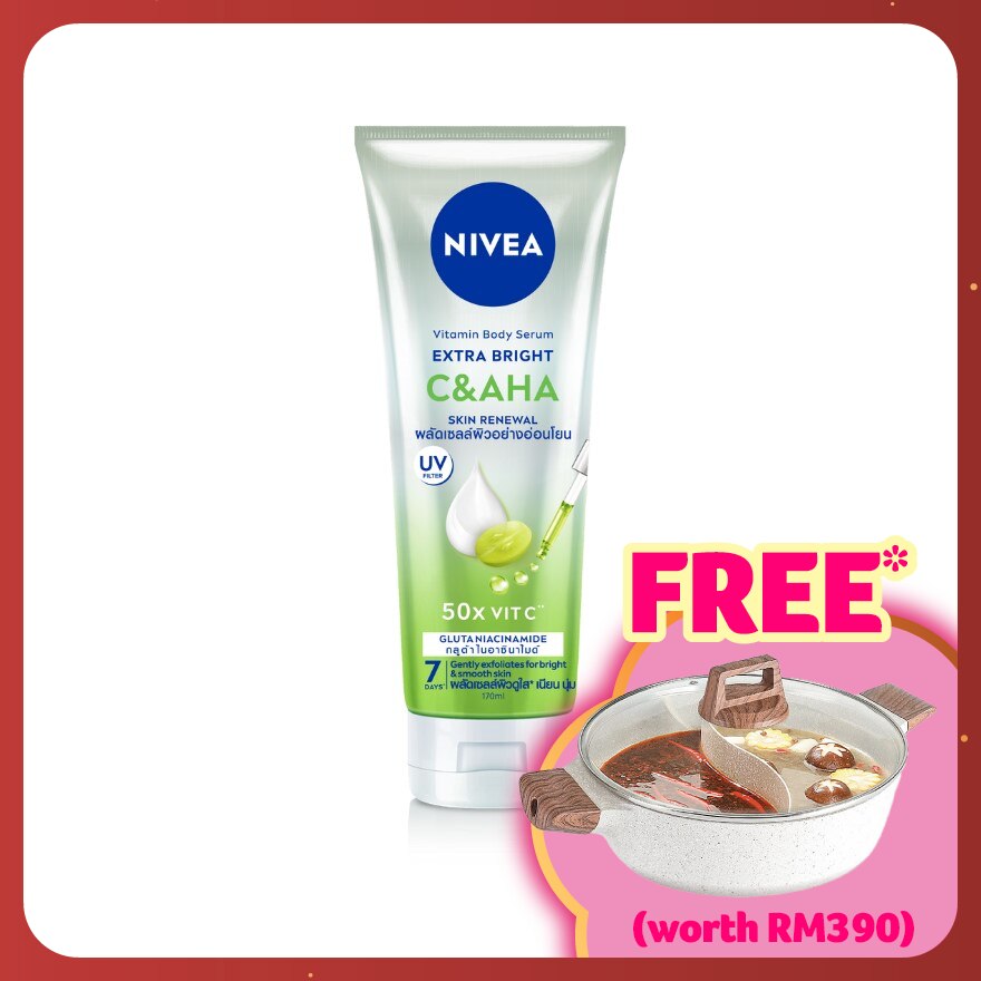 NIVEA Extra Bright C&AHA Vitamin Body Serum contains 50x Vitamin C, Glutathione, and Niacinamide to restore skin brightness and even skin tone. The combination of AHA, Vitamin C, Glycerin, and Shea Butter gently exfoliates dead skin cells without irritating the skin, helps to boost the skin renewal process. This concentrated formula not only absorbs quickly but is also non-sticky. Achieve bright and smooth skin in just 7 days.