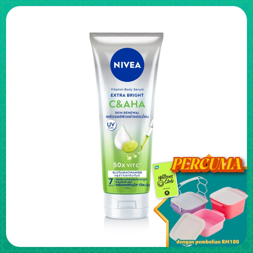 NIVEA Extra Bright C&AHA Vitamin Body Serum contains 50x Vitamin C, Glutathione, and Niacinamide to restore skin brightness and even skin tone. The combination of AHA, Vitamin C, Glycerin, and Shea Butter gently exfoliates dead skin cells without irritating the skin, helps to boost the skin renewal process. This concentrated formula not only absorbs quickly but is also non-sticky. Achieve bright and smooth skin in just 7 days.