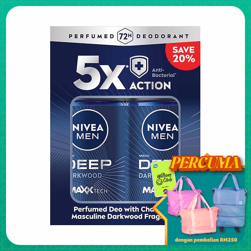 New NIVEA MEN Deep deodorant with the magnetic absorption of charcoal, protects you agaist sweat, bacteria and body odour. Gives you long lasting dryness and clean skin feel just like after shower. Reliable 72 hour anti-perspirant protection with skin tolerance dermatologically proven.