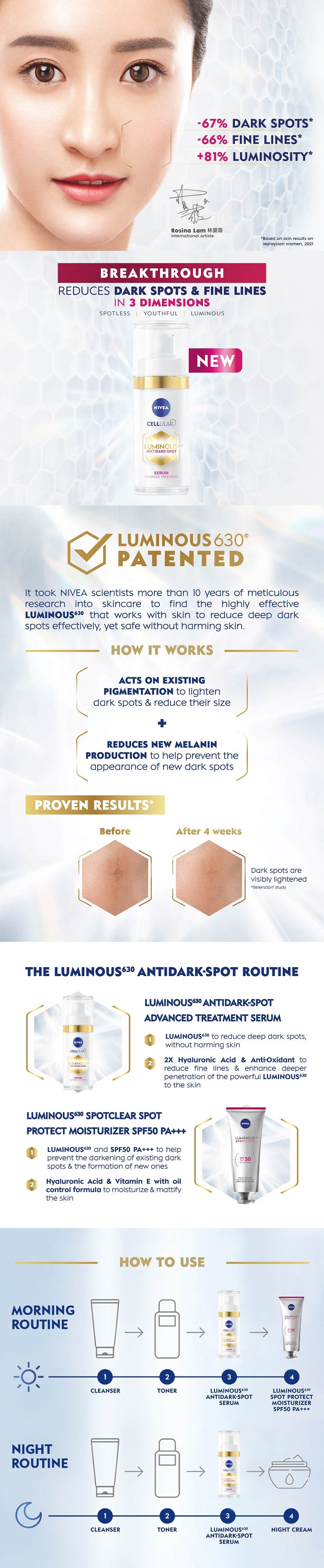 1. NIVEA Luminous630 Anti Spot Serum 30ml:Apply to cleansed face every morning & evening before your daily skin care routine. Pump 1 - 2 times for optimum dosage. Spreadall over the face, while avoiding direct eye contact.In the morning, for best results use in combination with NIVEA Luminous630 Spotclear Spot Protect SPF50 PA+++ per day.2. NIVEA Luminous630 Spotclear Spot Protect SPF50 PA+++ 40ml:Apply every morning on the whole face after NIVEA Luminous630TM Spotclear Booster Serum 30ml. For best protection,re-apply onceduring the day. Avoid direct eye contact, apply maximum 4 applications of all products with LUMINOUS630 per day.