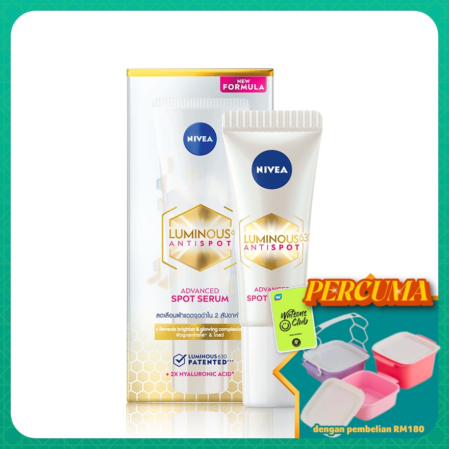 NIVEA Luminous630 Anti Spot Gold Serum 10ml - Targets at the root to reduce deep dark spots & fine lines in 2 weeks without harming skin. The formula is effective, yet safe to restore SPOTLESS, YOUTHFUL & LUMINOUS skin. Luminous630 is a breakthrough innovation after 10 years of research, proven to reduce & lighten deep dark spots at the root in just 2 weeks. Combined with 2X Hyaluronic Acid and Anti-Oxidant, the powerful Luminous630 penetrates deeper to the skin to smoothen fine lines & deeply moisturize.