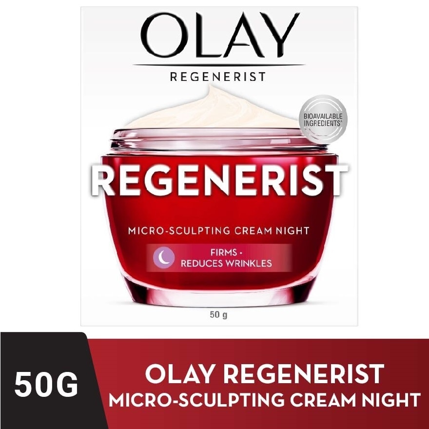 Olay Regenerist Micro Sculpting Cream Night 50g Luxurious Night Cream NIGHT 01 Hydrated, plumper skin 05 Noticeably firmer skin, 2X better exfoliation** 28 Visibly reduces lines & wrinkles TECHNOLOGY • Formula, with HYDRA-FIRMING COMPLEX + AMINO-PEPTIDE COMPLEX, helps retain skin's youthful look. • Light non-greasy formulation • No added fragrance **vs. no-treatment Features and Benefits: - Choose From Among The Following Regimen Steps From Regenerist: - Cleanser - Serum / Essence - Moisturiser - Eye / Treatment