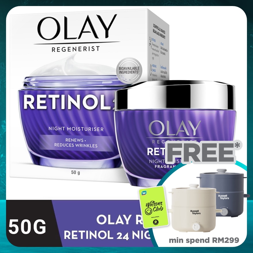 Olay Regenerist RETINOL24 Facial Moisturizer penetrates deep into skin’s surface layers. Our proprietary blend of Niacinamide + Retinol complex hydrates skin for 24 hours for a bounty of benefits. You’ll see visible improvements in fine lines & wrinkles, smoothness, brightness, firming, dark spots, and pores. This fragrance free and dye free moisturizer absorbs quickly and goes deep into your skin’s surface layers so you wake up every morning to glowing, plumper and younger-looking skin. Use with Olay Regenerist Luminous serum at night and see the skin transformation in 28 days. with regular use Features and Benefits - Wake up to plumper, younger-looking skin with Olay Retinol24 - Renews and resurfaces skin as you sleep, with 24-hour hydration - With bioavailable Retinoid powered by Olay's Niacinamide - Suitable for daily use, without the tradeoffs or drying the skin