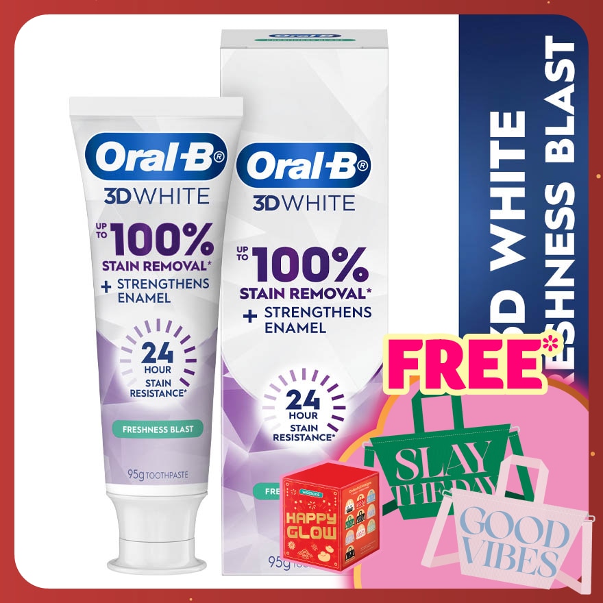 3DWhite Lasting White Toothpaste is clinically proven to remove up to 100% of stains* and provide 24 hour active stain resistance** Oral-B 3DWhite Lasting White Freshness Blast Toothpaste is peppermint flavoured to provide freshness during and after brushing. Oral-B is the #1 Toothbrush brand used by dentists worldwide.^ *by removal surface stains. **against surface stains with twice daily brushing. ^based on surveys of a representative sample of dentists' usage carried out for P&G continuously"