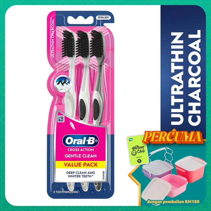 Product Description: Oral-B Cross Action Ultrathin Charcoal provides a deep clean and whiter teeth by removing surface stains. Features & Benefits: 1. CrissCross bristles are angled in opposite directions to lift and sweep away plaque bacteria 2. >0.01mm - Up to 20X thinner bristle tips for deep reach 3. Bristles infused with real charcoal extract
