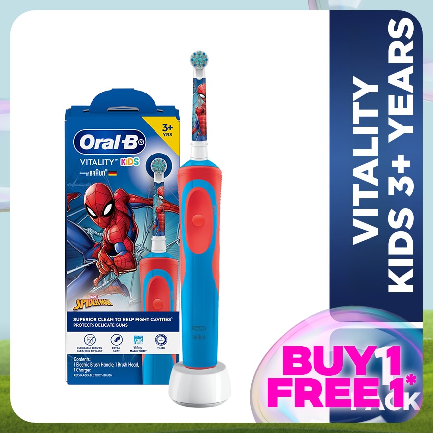 Oral-B Power toothbrush Kids Stages Cars 1s with 2 minute timer and rechargeable battery. 90% of kids brush longer with Disney Magic Timer App from Oral-B, 2D Action: High Speed Oscillating / Rotating Motion. 1 Feature: Daily Clean, 2 Minute Timer: Signals after 2 minutes to help you brush for the recommended brushing time.