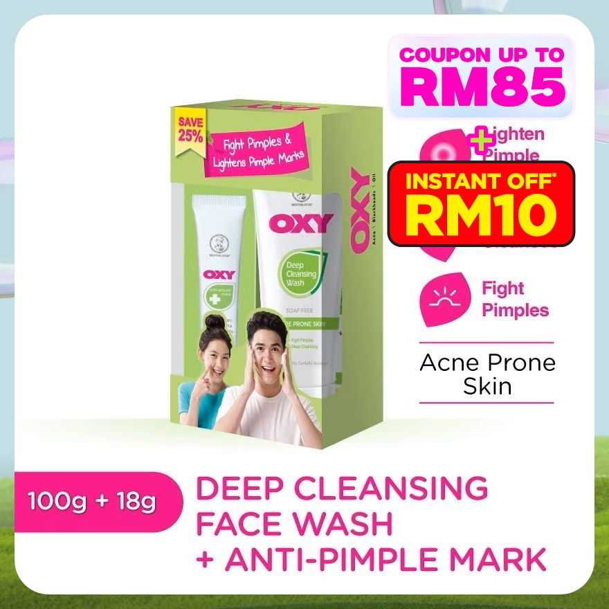 OXY Fight Pimples and Lighten Pimple Marks set Consist of OXY Deep Cleansing Wash to help fight pimples, deep cleanses the skin , and sooth redness OXY Anti-Pimple Mark helps to lighten pimple marks, dark spots and helps fight pimples