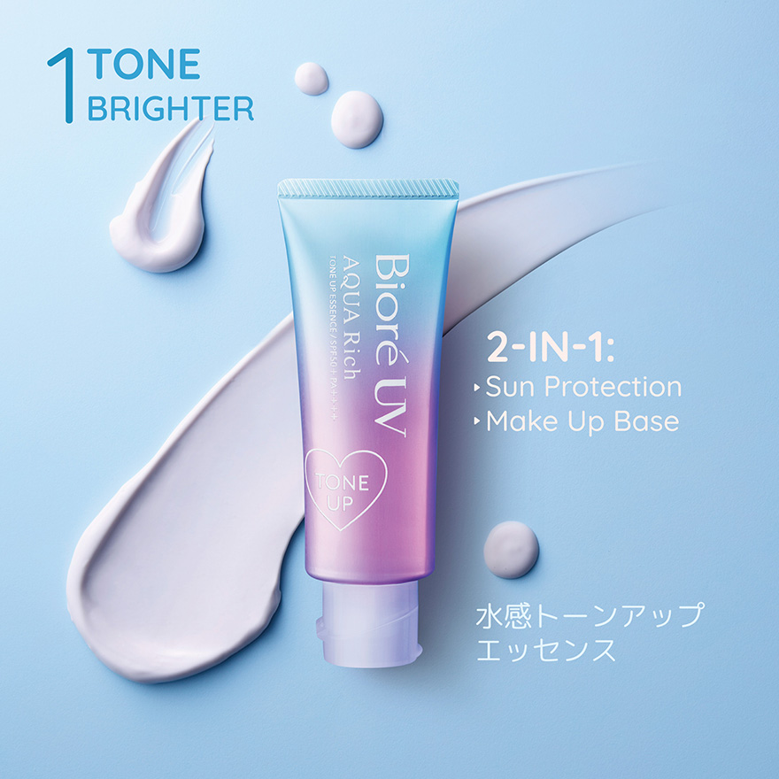 Biore UV Aqua Rich Tone up Essence SPF50/ PA++++ Combination of watery texture, Lavender tint, and Natural tone-up corrector for a bright, flawless look Formulated with 6 benefits 1. Prevent sunspot 2. Moisturizing ingredient for a supple, glowing look 3. Improve skin complexion 4. Leave a smooth finish 5. Control excessive sebum 6. Suitable for use as a make up base - Easy to remove - No white cast - Non-sticky - Gentle fregrance of mugnet - Very water-resistant formula - Non-comedogenic tested - Allergy tested