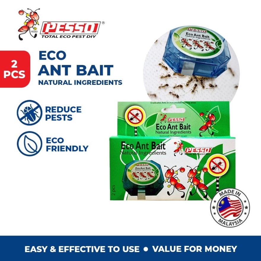 The PESSO Eco Ant Bait (2pcs) is a safe ant control solution designed to eliminate entire ant colonies through a delayed-action baiting system. Specifications: Package: Includes 2 pre-filled bait stations Active ingredient: Orthoboric acid (a natural mineral) Size: Dimension details are not readily available, but it's described as compact and discreet Target pests: Effective against all major ant species
