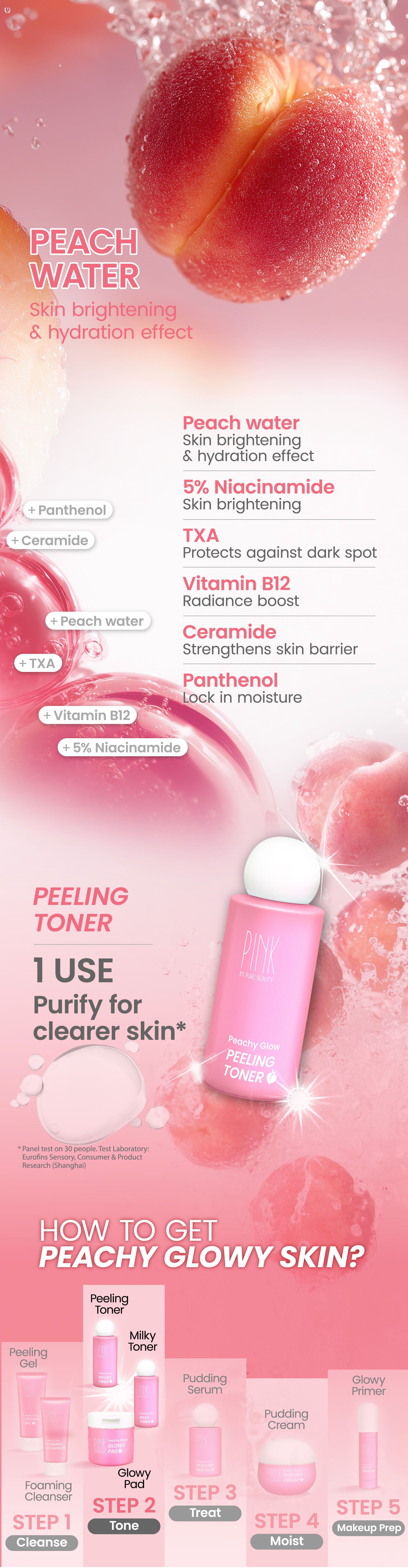 Prunus Persica (Peach) Fruit Water, Butylene Glycol, Niacinamide, Propanediol, Glycerin, Aqua, 1,2-Hexanediol, Lactobacillus Ferment, Prunus Persica (Peach) Juice, Hydroxyacetophenone, Sodium Citrate, Glycereth-25 PCA Isostearate, Citric Acid, Zea Mays Kemel Extract, Ethylhexylglycerin, Xanthan Gum, Trisodium Ethylenediamine Disuccinate, Parfum, Tranexamic Acid, Hyaluronic Acid, Hydrolyzed Hyaluronic Acid, Sodium Hyaluronate, Fructan, Cyanocobalamin, Glucose, Panthenol, Caprylic/Capric Triglyceride, Ceramide NP, Hydrogenated Lecithin.
