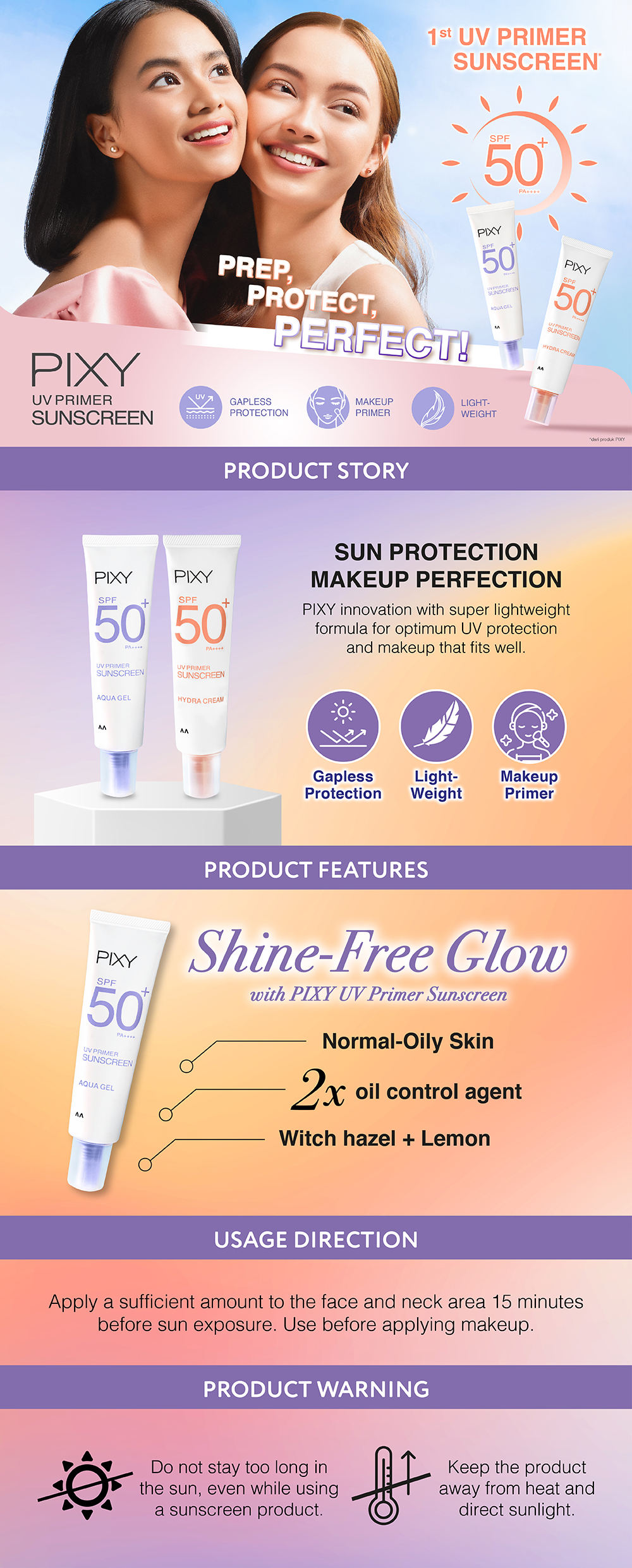 2-in-1 Primer & Sunscreen: Helps to protect the skin from UV Ray with SPF 50+ PA++++ , smoothens your skin, ensure a smooth application of makeup and an even-looking complexion. Sun protection with a lightweight water-based formula, no white cast and easily absorbed into skin. Suitable for normal to oily skin.