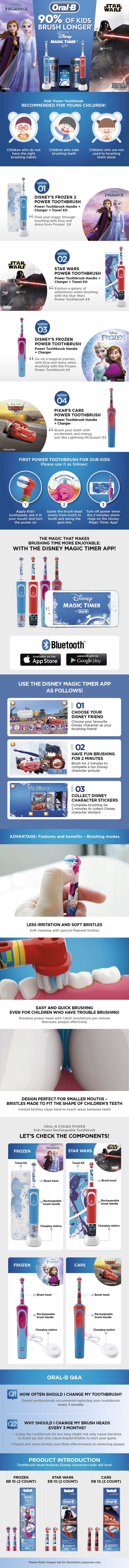 1. Designed to help kids brush well 2. 2 MINUTE TIMER Signals to let kids know when they achieve 2 minutes of brushing time 3. Daily Clean - Comprehensive everyday cleaning 4. RECHARGEABLE BATTERY The helpful rechargeable battery in the handle ensures that their brushing fun is always ready to go at the touch of a button. The battery can last up to 5 days on a single charge. (2min, 2x/day) 5. Makes brushing fun with FROZEN characters 6. 1 HANDLE ,1 CHARGING STATION, 1 BRUSH HEAD