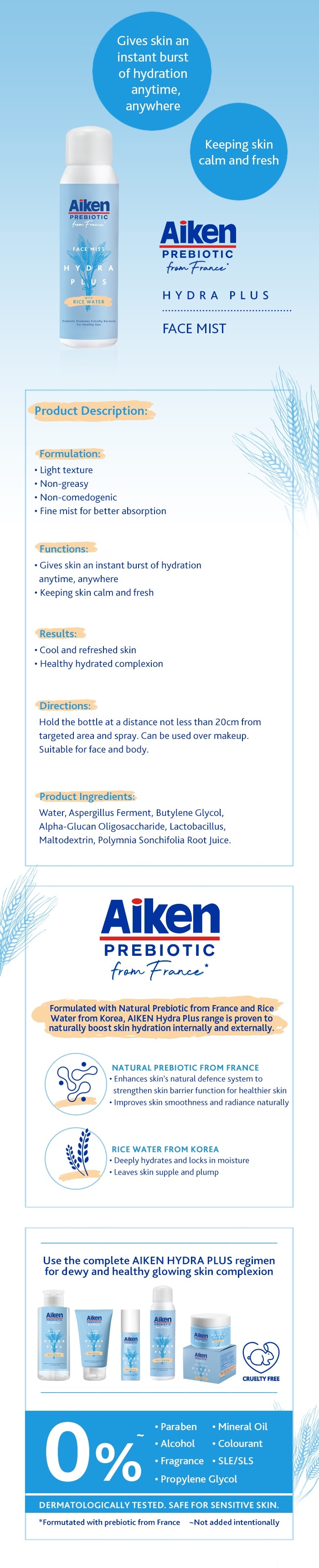 Light texture, Non-greasy, Non-comedogenic, Fine mist for better absorption. It Gives skin an instant burst of hydration anytime, anywhere keeping skin calm and fresh. Resulting in a Cool and refreshed skin, Healthy hydrated complexion. 0% Paraben, Mineral Oil, Alcohol, Colourant, Fragrance, Propylene, SLES/SLS. Dermatologically Tested. Safe For Sensitive Skin. Formulated with Natural Prebiotic from France and Rice Water from Korea, AIKEN Hydra Plus range is proven to naturally boost skin hydration internally and externally. NATURAL PREBIOTIC FROM FRANCE promotes the growth of skin friendly-bacteria to strengthen skin barrier function for heathier skin, Improves skin smoothness and radiance naturally. RICE WATER FROM KOREA deeply hydrates and locsks in moisture, Leaves skin supple and plump. Use the complete AIKEN HYDRA PLUS regimen for dewy and healthy glowing skin complexion.