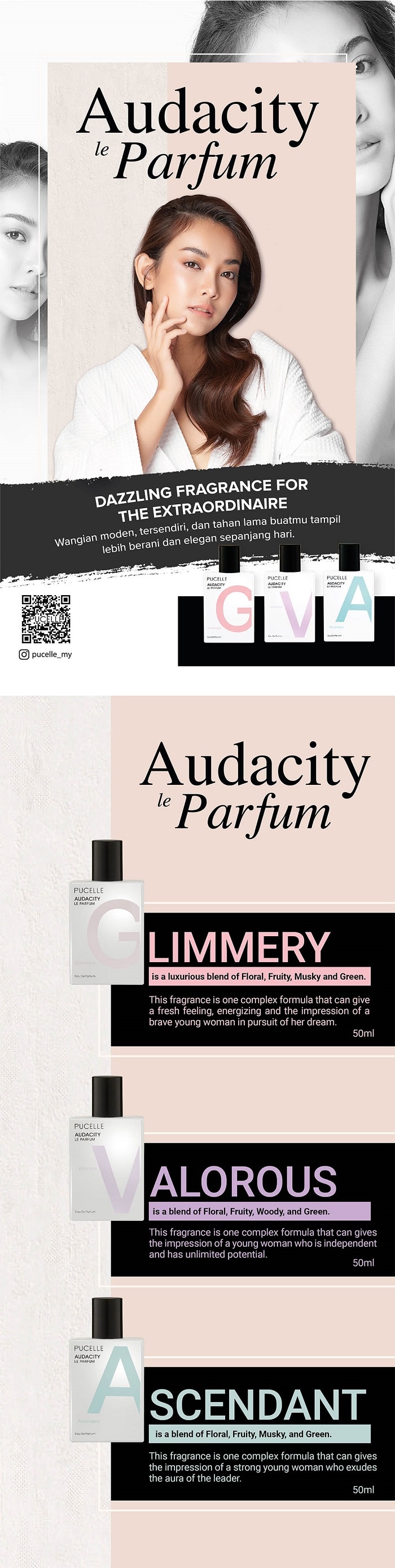 Pucelle Audacity Eau De Parfum Glimmery 50ml Glimmery is a luxurious blend of Floral, Fruity, Musky and Green. This fragrance is one complex formula that can give a fresh feeling, energizing and the impression of a brave young woman in pursuit of her dream
