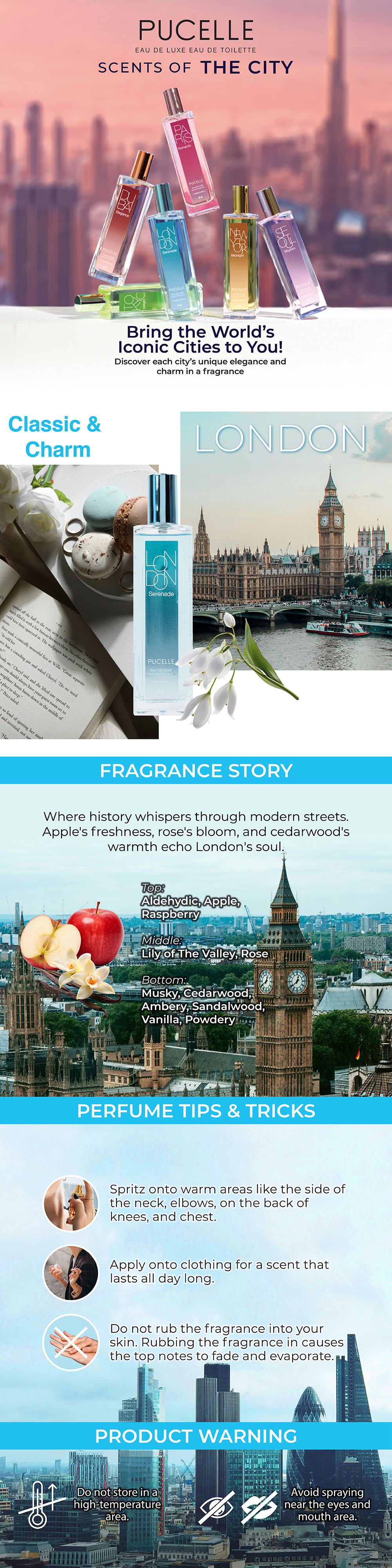 FLORAL, MUSKY, ALDEHYDIC, FRUITY London Serenade beautifully captures the essence of London, where history meets modern life. It opens with fresh aldehydic, apple, and raspberry notes, reminiscent of a crisp London morning, and blossoms into a floral heart of lily of the valley and rose. The scent closed with warm, musky cedarwood, ambery tones, sandalwood, vanilla, and a soft powdery touch, embodying the city's timeless elegance.