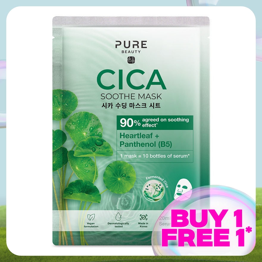The Pure Beauty Cica Soothe Mask is infused with Fermented Cica, helps to soothe irritated skin, calms and comforts skin. It delivers intense hydration and is suitable for sensitive skin.