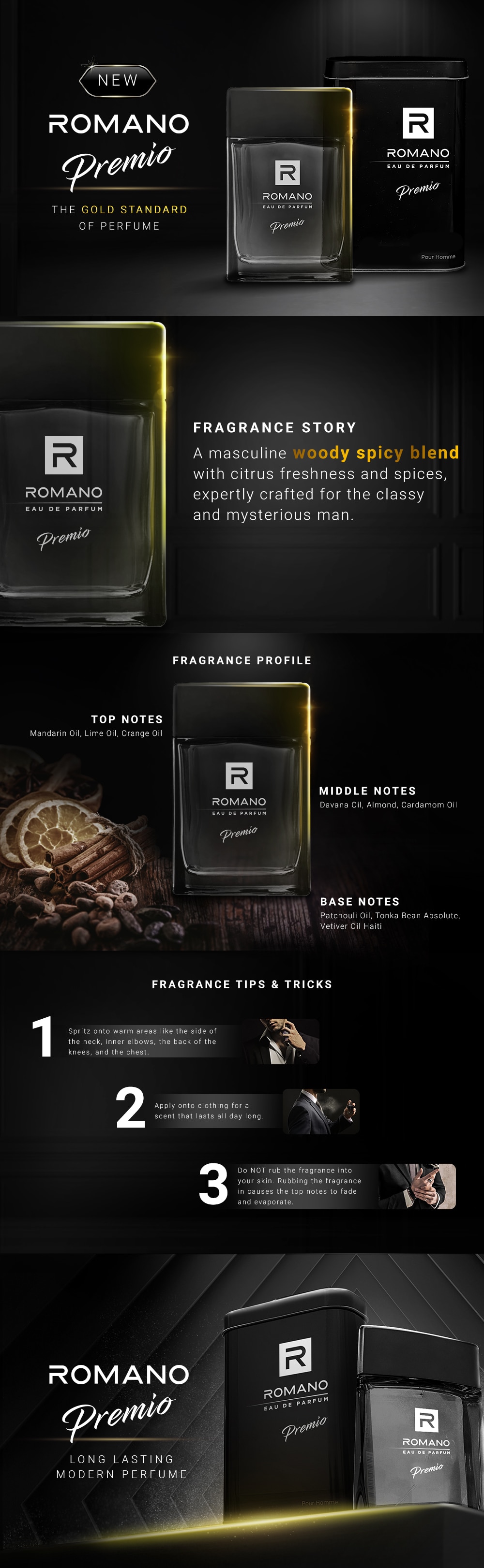 ROMANO Premio Eau De Parfum is the gold standard of fragrance, with longer lasting fragrance, masculine and woody spicy smell. A warm and unique fragrance with citrus freshness and spices, expertly crafted for the classy and mysterious man.