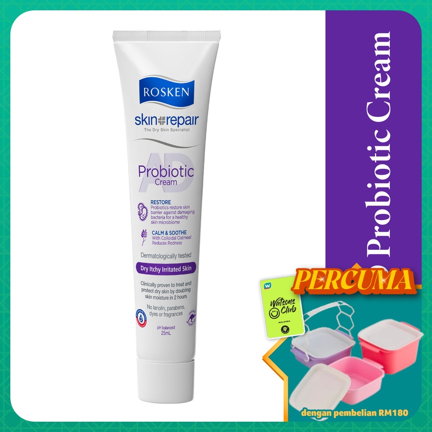 Rosken AD Probiotic Cream is dermatologically tested and clinically proven to treat and protect irritation prone skin. An intensive moisturiser that helps strengthen the skin's natural protection, providing restoration and relief for very dry, itchy and irritated skin. This unique formula is enriched with a special blend of Probiotics derived from Yogurt Extract, as well as 20mg/g of Colloidal Oatmeal to restore and relieve very dry skin