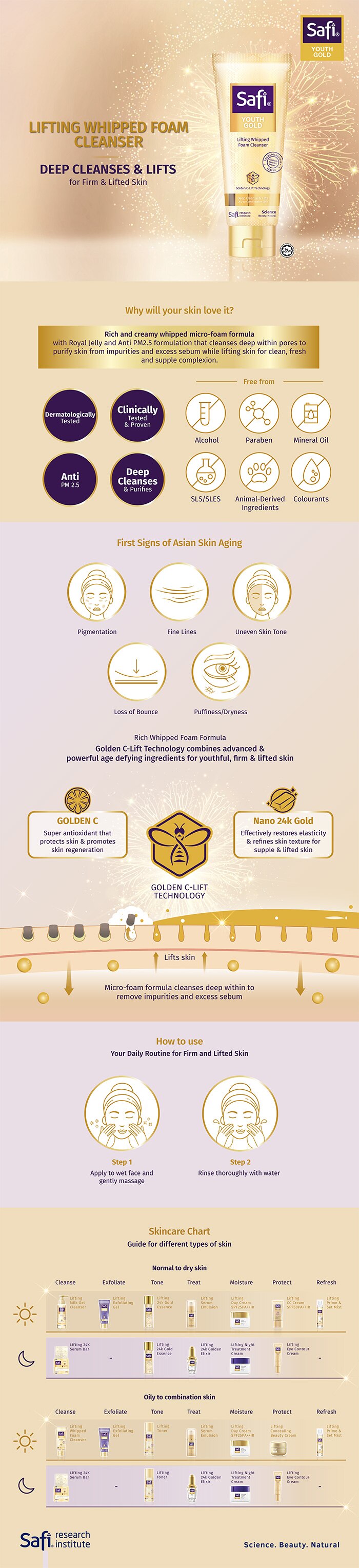 Water, Myristic Acid, GIycerin, Palmitic Acid, Stearic Acid, Potassium Hydroxide, Potassium Cocoyl Glycinate, Methylpropanediol, Glyceryl Stearate, Avocado Oil, Lauric Acid, Mica, PentasodiumTnphosphate, Polyquatemium-10, BHT, Tetrasodium EDTA, Niacinamide, Acetyl Heptapeptide-Gold, Palmitoyl Tripeptide-5, Pearl Powder, Fragrance, Methylisothiazolinone, CI 77491, CI 77891.