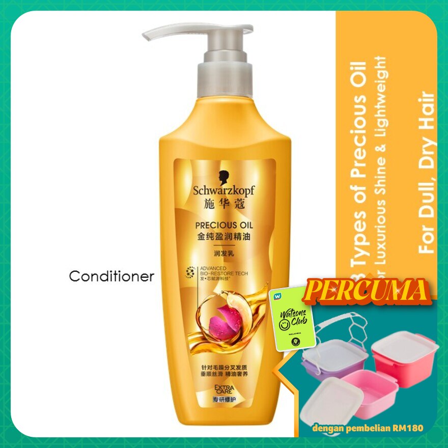 Precious Oil Conditioner 400ml. BIO-RESTORE COMPLEX . ILLUMINATING AND DEFRIZZING. FOR DULL AND DRY HAIR. ROSE DAMASCUS OIL Creates a 3-layered luxurious experience; the silky feeling, the radiant yet lightweight finish and the romantic vibe of French roses. The formula with 8 essential oils offers intense repair, anti-frizz effect and instant combability. Damascus rose essential oil is known to nourish and enhance the sensorial hair care experience. How to Use, After shampoo, apply gently into wet hair. Leave for 1 minute and rinse thoroughly. For best result, use together with Extra Care Shampoo.