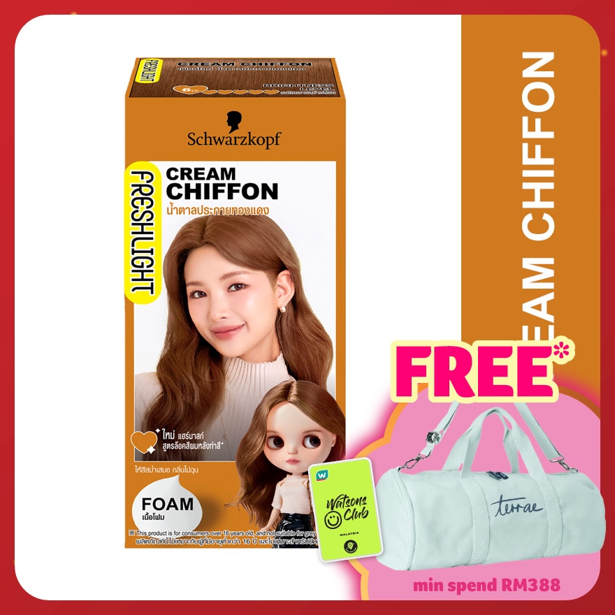 Freshlight Foam Colour Cream Chiffon : Aqua (Water, Eau), Ammonium Bicarbonate, Cocamidopropyl Betaine, Ammonium Hydroxide Propylene Glycol, Sodium Chloride, Parfum (Fragrance), Sodium Sulfite, 4-Amino-2, Hydroxytoluene, p-Aminophenol, Ascorbic Acid, Tetrasodium EDTA, Sodium Sulfate, Ammonium Carbonate, Sodium Benzoate, Toluene-2,5-Diamine Sulfate, Potassium Hydroxide, Betaine, Sodium PCA, Sorbitol, Serine, Glycine, Glutamic Acid, Alanine, Arginine, Lysine, Threonine, Proline. Developer: Aqua (Water, Eau), Ceteth-40, Hydrogen Peroxide, Glycerin, Cocamine Oxide, Behenyl Alcohol, Phosphoric Acid, PEG-45 Stearate, Phenoxyethanol, Polyquaternium-6, Polyquaternium-10, Etidronic Acid. Hair Mask : Aqua, Cetearyl Alcohol, Dimethicone, Amodimethicone, Isopropyl Myristate, Behentrimonium Chloride, Distearoylethyl Hydroxyethylmonium Methosulfate, Stearamidopropyl Dimethylamine, Cetyl Palmitate, Dipropylene Glycol, Fragrance, Phenoxyethanol, Isopropyl Alcohol, Methylparaben, Bisamino PEG/PPG-41/3 Aminoethyl PG-Propyl Dimethicone, Lactic Acid, Panthenol, Succinic Acid, Magnesium Chloride, Vegetable Oil, Guar Hydroxypropyltrimonium Chloride, Steardimonium Hydroxypropyl Hydrolyzed Keratin, Camelina Sativa Seed Oil, Hydrolyzed Keratin, Sodium Hyaluronate, Pentaerythrityl Tetra-Di-t-Butyl Hydroxyhydrocinnamate, Potassium Sorbate.