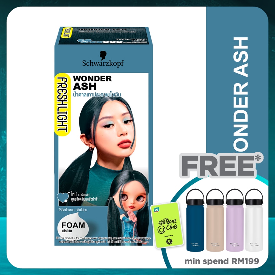 Freshlight Foam Colour Wonder Ash : Aqua (Water, Eau), Ammonium Bicarbonate, Cocamidopropyl Betaine, Ammonium Hydroxide, Propylene Glycol, Sodium Chloride, 2-Amino-4-Hydroxyethylaminoanisole Sulfate, Potassium Hydroxide, Toluene-2,5-Diamine Sulfate, Parfum (Fragrance), Sodium Sulfite, Ascorbic Acid, Tetrasodium EDTA, Sodium Sulfate, Ammonium Carbonate, Sodium Benzoate, Betaine, Sodium PCA, Sorbitol, Serine, Glycine, Glutamic Acid, Alanine, Arginine, Lysine, Threonine, Proline. Developer: Aqua (Water, Eau), Ceteth-40, Hydrogen Peroxide, Glycerin, Cocamine Oxide, Behenyl Alcohol, Phosphoric Acid, PEG-45 Stearate, Phenoxyethanol, Polyquaternium-6, Polyquaternium-10, Etidronic Acid. Hair Mask : Aqua, Cetearyl Alcohol, Dimethicone, Amodimethicone, Isopropyl Myristate, Behentrimonium Chloride, Distearoylethyl Hydroxyethylmonium Methosulfate, Stearamidopropyl Dimethylamine, Cetyl Palmitate, Dipropylene Glycol, Fragrance, Phenoxyethanol, Isopropyl Alcohol, Methylparaben, Bisamino PEG/PPG-41/3 Aminoethyl PG-Propyl Dimethicone, Lactic Acid, Panthenol, Succinic Acid, Magnesium Chloride, Vegetable Oil, Guar Hydroxypropyltrimonium Chloride, Steardimonium Hydroxypropyl Hydrolyzed Keratin, Camelina Sativa Seed Oil, Hydrolyzed Keratin, Sodium Hyaluronate, Pentaerythrityl Tetra-Di-t-Butyl Hydroxyhydrocinnamate, Potassium Sorbate.