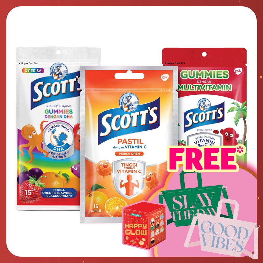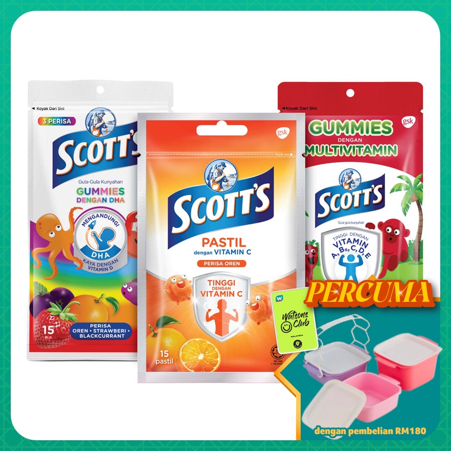 SCOTT's DHA Gummies are designed especially for older kids (5+) in delicious fruity flavors that children enjoy with the benefits of fish oil Omega 3 fatty acid DHA and a rich source of Vitamin D.Halal certified.Scott's DHA Chewable Gummies, Fish Oil Omega 3 Children Supplement for Immunity and Brain Development Support, Assorted Flavour, (1 x 15s) + Containing natural orange juice, these delicious soft chewy pastilles are a fun and tasty way to give your child Vitamin C supplement.+ Scott's Multivtiamin Gummies is a soft gelatine candy to be consumed as part of healthy and varied daily diet. Not suitable for vegetarians. To be consumed under adult supervision. Product is designed for use by consumers 5 years and above. Scott's Multivitamin Gummies contains Zinc and 5 Essential Vitamins A, B6, C, D & E to support your growing kids everyday.Available in 3 fruity flavors that kids love, mango, apple and tropical fruits.Scott's Multivitamin Gummies provides Vitamin A, B6, C, D and Zinc that support healthy immune functionScott's Multivitamin Gummies contains Vitamin D, C and Zinc that helps contribute to the maintenance of healthy growth and bone development in children.Scott's Multivitamin Gummies with Vitamin A and Zinc helps support healthy vision in children.