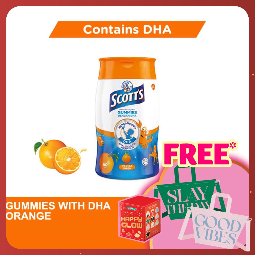 SCOTT's DHA Gummies are designed especially for older kids (5+) in delicious orange flavors that children enjoy with the benefits of fish oil Omega 3 fatty acid DHA and a rich source of Vitamin D. Halal certified. Scott's DHA Chewable Gummies, Fish Oil Omega 3 Children Supplement for Immunity and Brain Development Support, Orange Flavour, (60s)