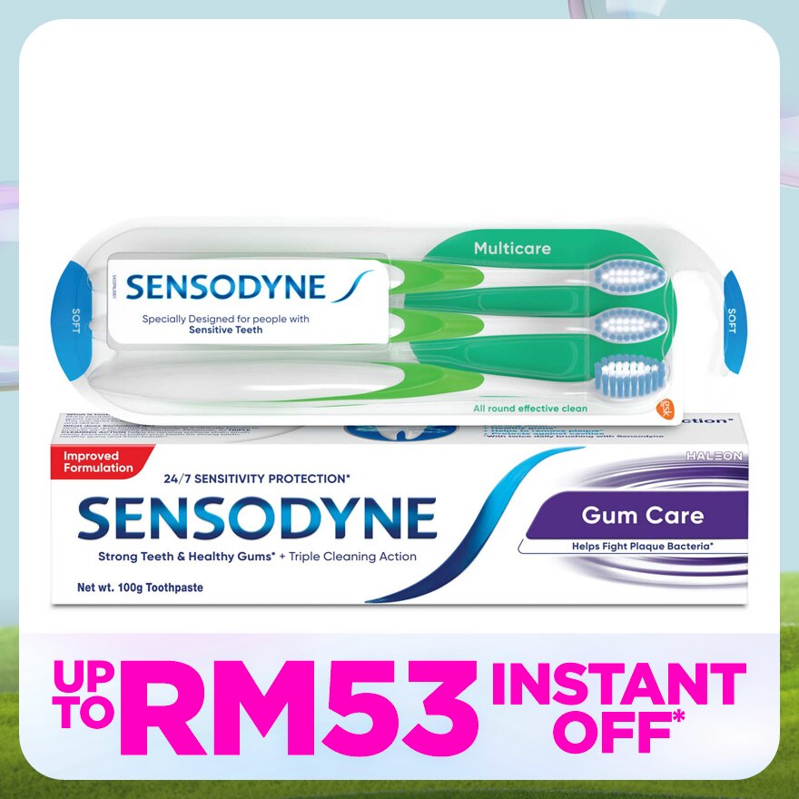 Benefits of Sensodyne Gum Care Toothpaste: Works deep inside the tooth to relieve sensitivity. Builds increasing protection against sensitivity of the teeth to e.g. cold drinks, hot food or tooth brushing. Targets and remove plaque bacteria to maintain healthy gums. Contains fluoride that strengthens teeth and protects against decay. Clinically proven relief and daily protection for sensitive teeth. With twice daily brushing Kebaikan ubat gigi Sensodyne Gum Care: Bertindak jauh ke dalam gigi untuk melegakan gigi sensitif. Meningkatkan perlindungan terhadap gigi sensitif, misalnya terhadap minuman sejuk, makanan panas atau pemberusan gigi. Menyasarkan dan menyingkirkan bakteria plak untuk mengekalkan gusi yang sihat. Mengandungi fluorida yang menguatkan gigi dan melindungi daripada pereputan gigi. Kelegaan dan perlindungan harian untuk gigi sensitif yang terbukti secara klinikal. Dengan memberus gigi dua kali sehari. Sensodyne Multicare toothbrush has been specially designed silky bristles are designed to gently clean teeth. Its small angled head is specially designed to provide effective cleaning, even in hard to reach areas. For effective cleaning of your teeth and gums we recommend twice daily brushing with a fluoride toothpaste and Sensodyne Precision toothbrush.