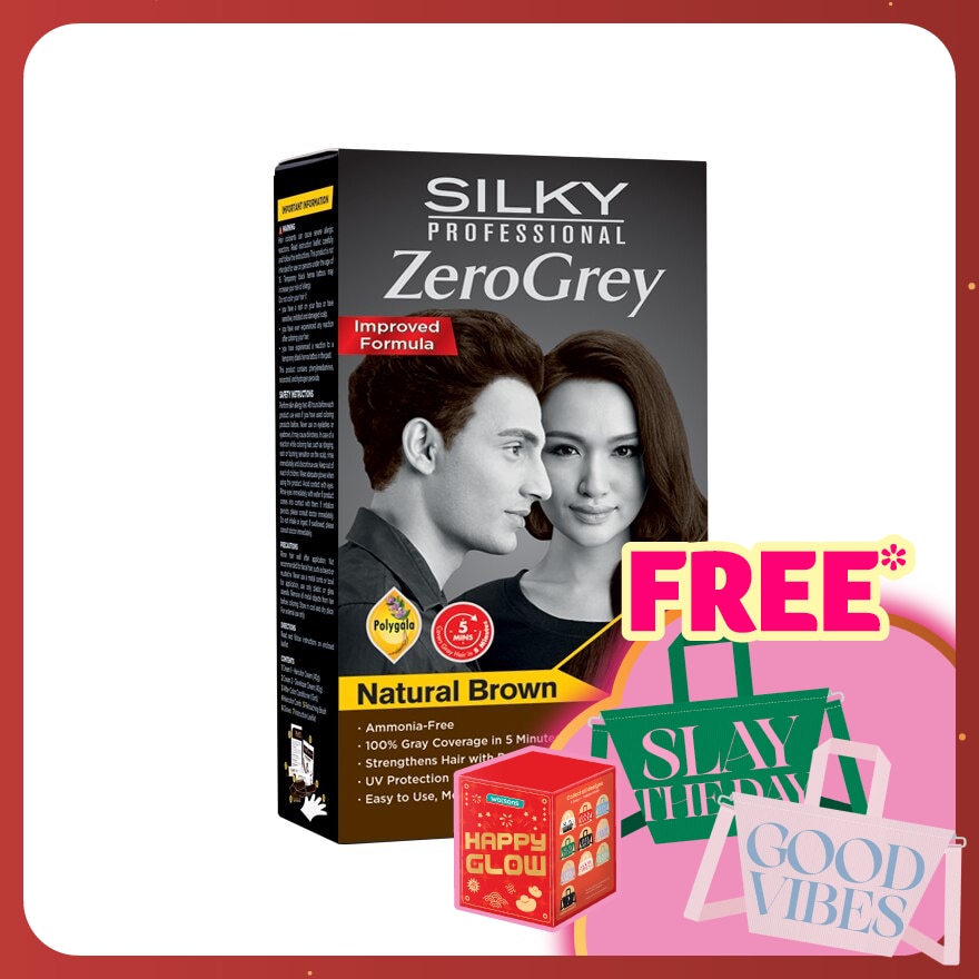 Bring back years of youth with SILKY professional ZeroGrey Haircolor.This ammonia-free, mess-free hair colors covers 100% gray in just 5minutes.Formulated with Polygala, this permanent hair color deeply nourishes hair and protect hair from damaging.Zerogrey is also enriched with Argan & Olive Oils to add a healthy and radiant shine to your hair. The intensive After-Color Conditioner contains Wild Mango butter, Panthenol & Aloe Vera to provide deep moisturizing from roots to tips.