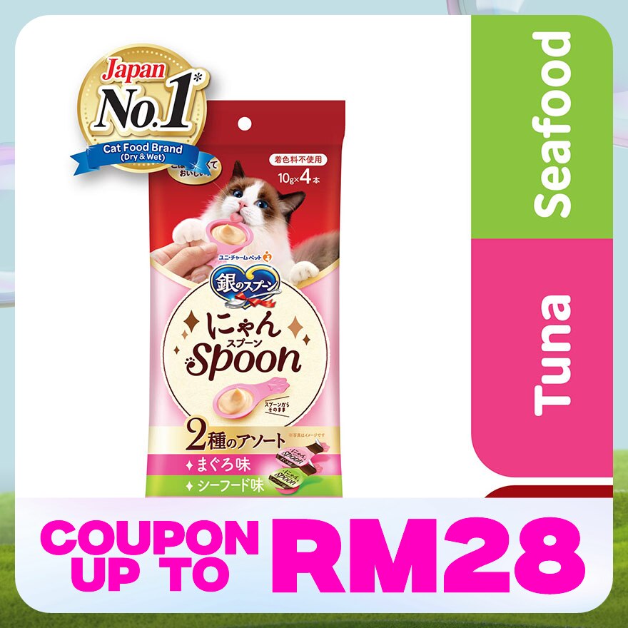 Nyan Spoon Tuna & Seafood 10g x 4s is the first spoon cat treats that made with Real Tuna & Seafood! Patented Easy Feed Spoon design that don’t spill easily. Each spoon is rich in Umami flavour, leaving cats wanting more. No artificial dyes, healtheir treats option. Contain Vitamin E to ehance healthy coat and skin for your cat. An assortment of two flavors in one bag including Tuna & Seafoods.