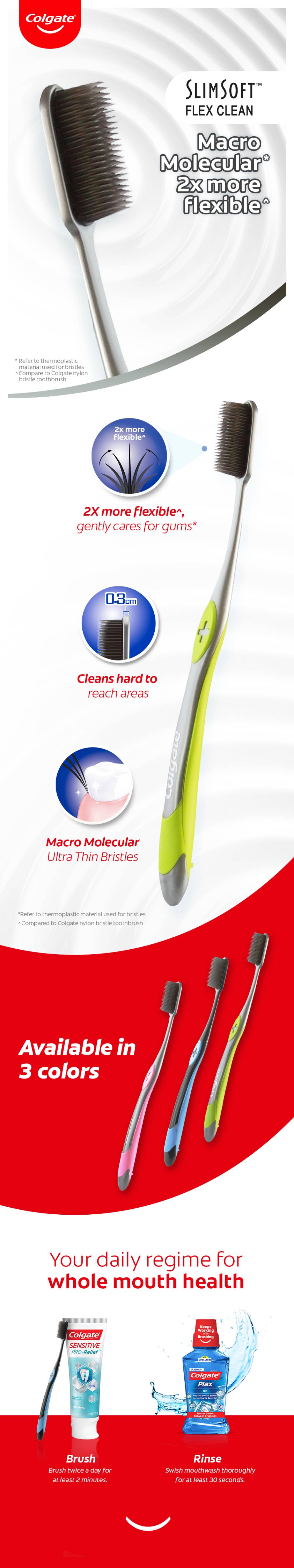 The next generation macro molecular^ ultra thin bristles for deeper cleaning along gum line and in between teeth^^.!With macro molecular toothbrush bristle material, the bristles are 2 times more flexible^^^ and it gently cares for gums #. Colgate SlimSoft Flex Clean Charcoal Toothbrush also has the thinnest + compact head of only 0.3cm to clean areas that are difficult to reach and help remove bacteria in mouth.