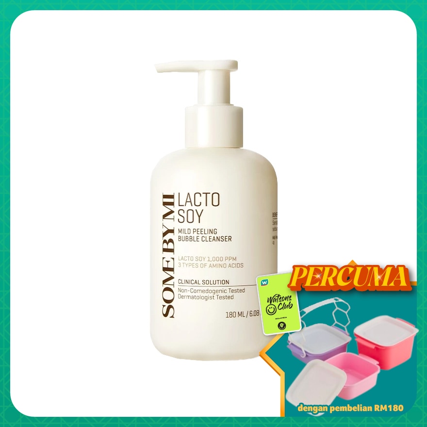 Information: SOME BY MI Lacto Soy Mild Peeling Bubble Cleanser is a gentle, vegan-friendly gel-to-foam cleanser designed to exfoliate and purify the skin without causing irritation. Formulated with 1,000 ppm of Lacto Soy;a blend of soy milk ferment filtrate and lactobacillus; it delivers amino acid-rich nourishment to the skin, enhancing hydration and strengthening the skin barrier. The inclusion of konjac-derived glucomannan provides a mild physical exfoliation, effectively removing dead skin cells and impurities to reveal a smoother complexion. Additional hydrating ingredients like glycerin, betaine, and glucose help maintain the skin's moisture balance, leaving it refreshed and supple after cleansing. Dermatologically tested and non-comedogenic, this cleanser is suitable for all skin types, including sensitive skin. Ingredients We Love: Lacto Soy (Lactobacillus/Soy Milk Ferment Filtrate) - Provides amino acids and probiotics to nourish and strengthen the skin barrier. Glucomannan (Konjac-derived) - Offers gentle physical exfoliation to remove dead skin cells. Glycerin & Betaine - Humectants that draw moisture into the skin, keeping it hydrated. Glucose - A natural sugar that helps maintain skin hydration and supports the skin's natural barrier. Amino Acids (Serine, Glutamic Acid, Aspartic Acid) - Aid in skin hydration and repair, promoting a healthy complexion.