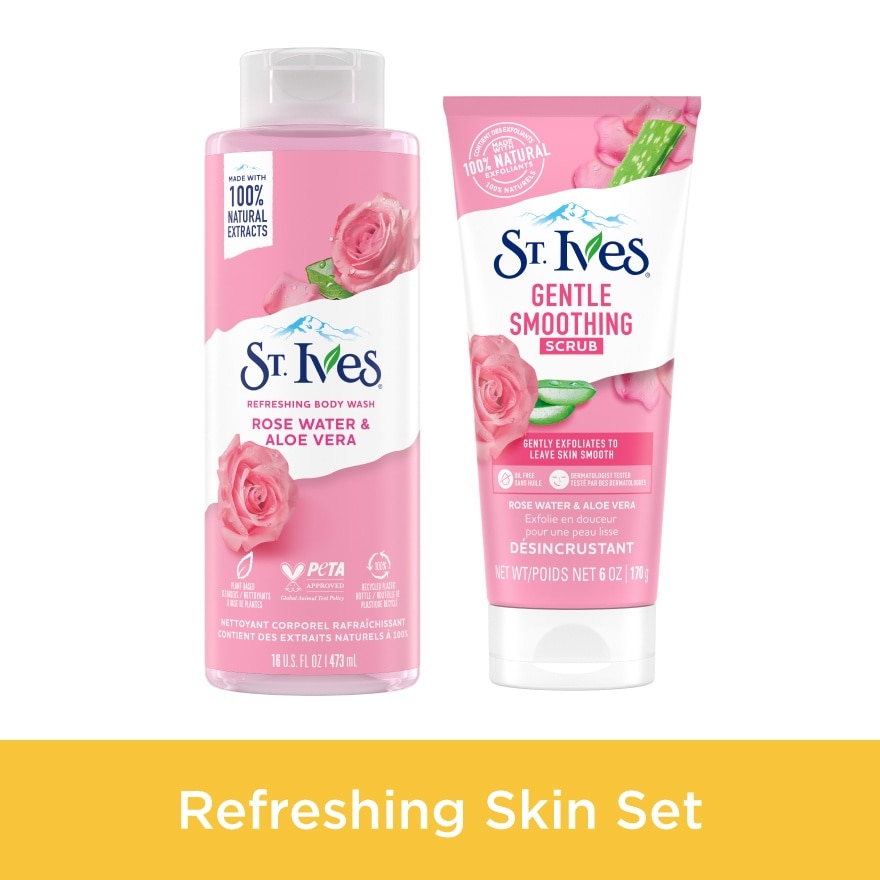 Refreshing Rose Water & Aloe Vera Body Wash 450mlMade with 100% natural rose and aloe vera extracts. This paraben free, dermatologist tested formula refreshes for a balanced feel.Rose Water & Aloe Vera Scrub 170gMade with 100% natural walnut shell powder and crushed rose petals, this scrub gently exfoliates to leave skin smooth. *Made with 100% Natural Exfoliants *Paraben-Free *Oil-Free *Non-Comedogenic *Dermatologist-Tested