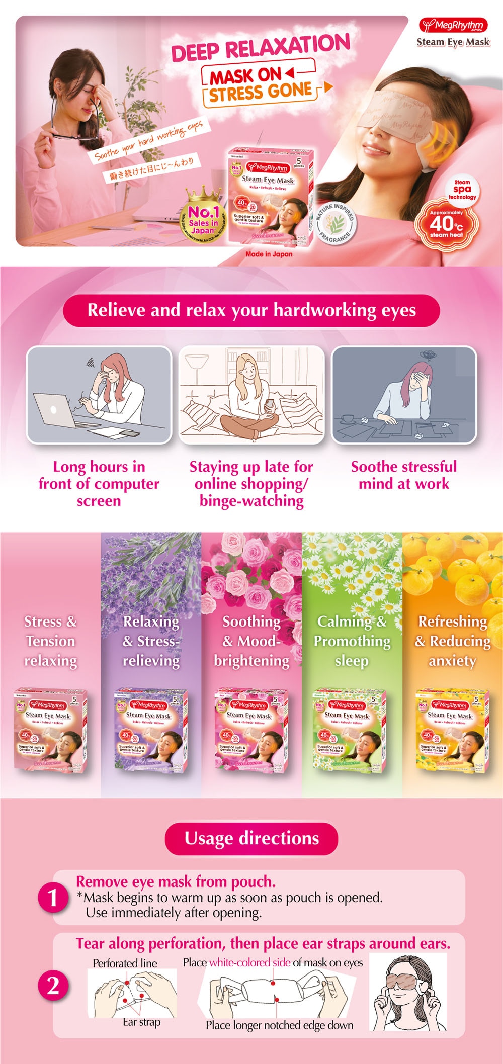 An innovative self-warming Steam Eye Mask developed with Japan’s unique and innovative steam heat technology.