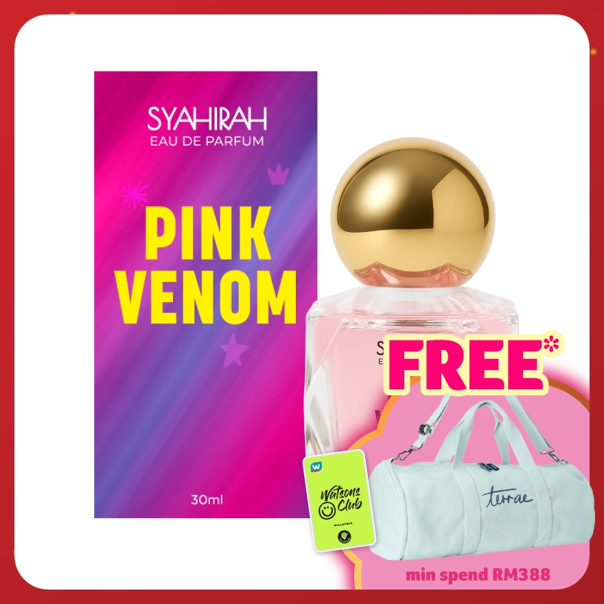 SYAHIRAH EAU DE PARFUM Pink Venom Feminine, with a twist.It starts fresh with bergamot, pear & rose, blooms into freesia, lily of the valley & orange, and settles with a crisp edge of apple, cedarwood & geranium. A nod to bold, playful florals with a modern attitude. Fresh. Fierce. Quietly loud.
