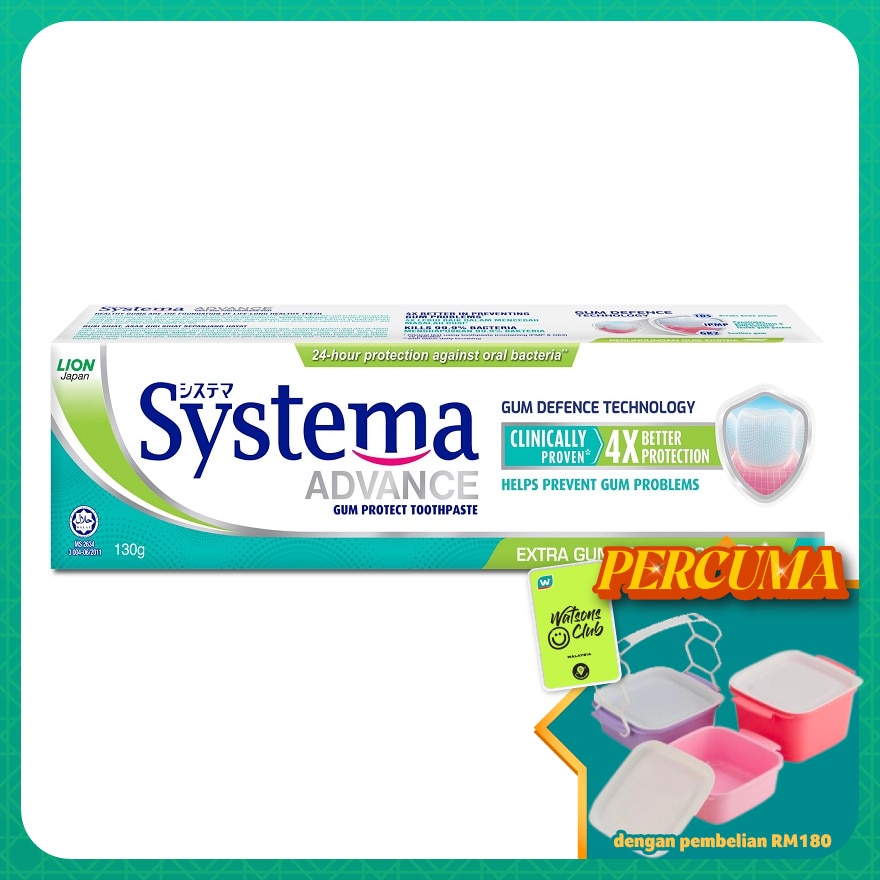 Systema Advance Toothpaste is Lion Japan’s biggest breakthrough which combined IPMP, TDS, GK2 that breaks down plaque and kills bacteria in GUM POCKET SYSTEMA Advance Toothpaste is clinically proven to: -BREAK DOWN PLAQUE & KILLS 99.9% BACTERIA* in hard-to-reach areas like the plaque biofilm in gum pocket -4X BETTER in preventing gum problems** -24 HOUR PROTECTION*** against oral bacteria SYSTEMA Advance Extra Gum Protection Anti-Plaque Toothpaste - with great aromatic mint flavour *P.gingivalis ** Clinical test using toothpaste (containing IPMP & GK2) vs. placebo *** with twice daily brushing.