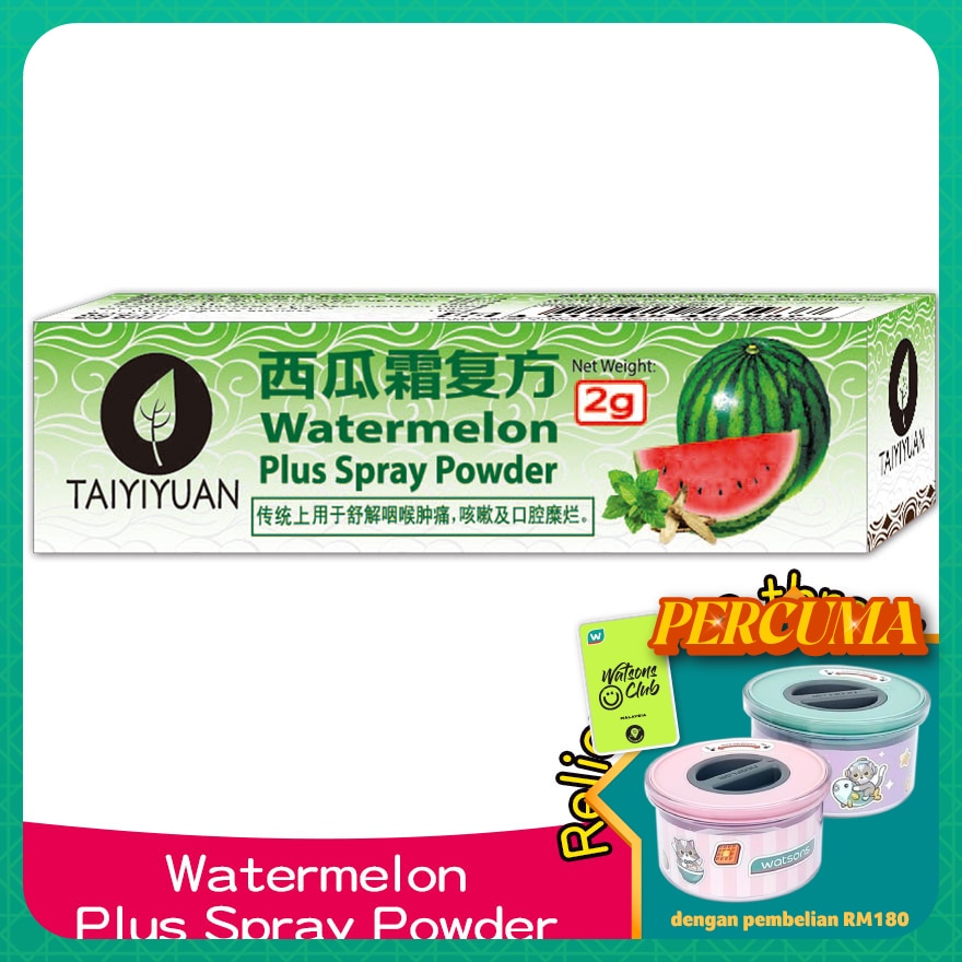 Watermelon Plus Spray Frost Powder 2g (*MAL Item) Spray on the affected area 3 times daily to relieve of sore throat, cough and mouth ulcers due to heatiness.
