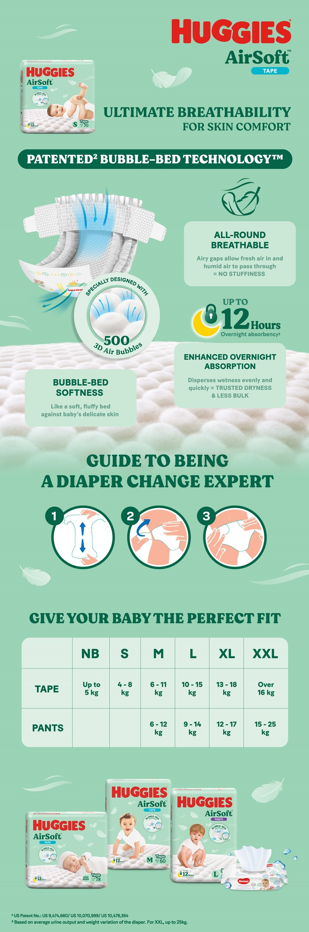 HUGGIES AirSoft Tape Diapers are specially designed with Breathable BUBBLE-BED for Ultimate Airy Comfort your baby's delicate skin - while providing up to 12 hours Overnight Absorbency. ed with Breathable BUBBLE-BED to protect baby's delicate skin.