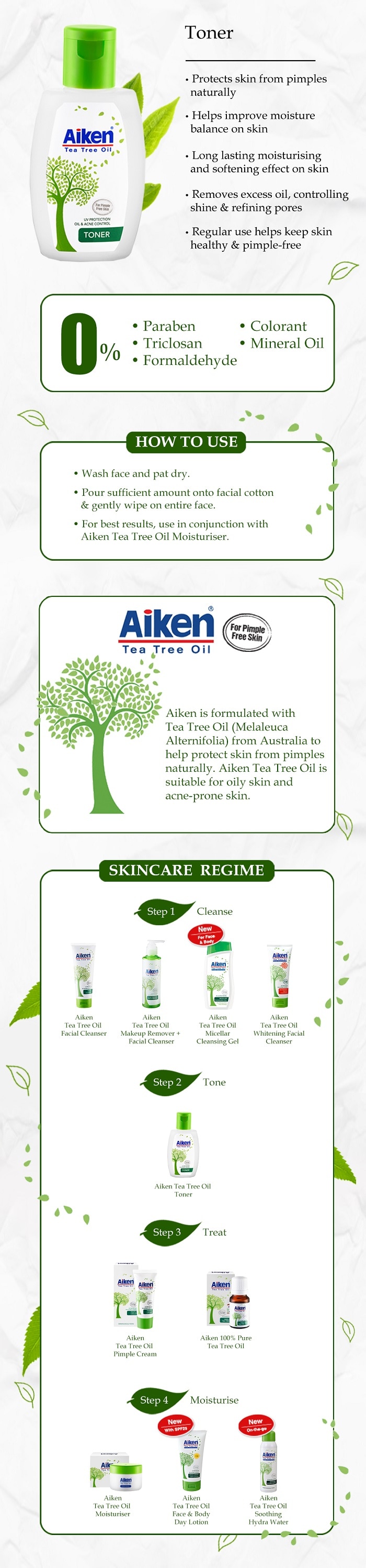 - Contains Tea Tree Oil (Melaleuca Alternifolia) to help protect skin from pimples naturally. - Mild toner with natural plant extracts. Contains NMF for long lasting moisturising and softening effect on skin. - Helps improve moisture balance on skin. - Specially formulated to target pimple-prone skin & remove excess oil, controlling shine and refining pores. - Helps to soothe and refresh skin. - Regular use helps keep skin healthy and pimple free.