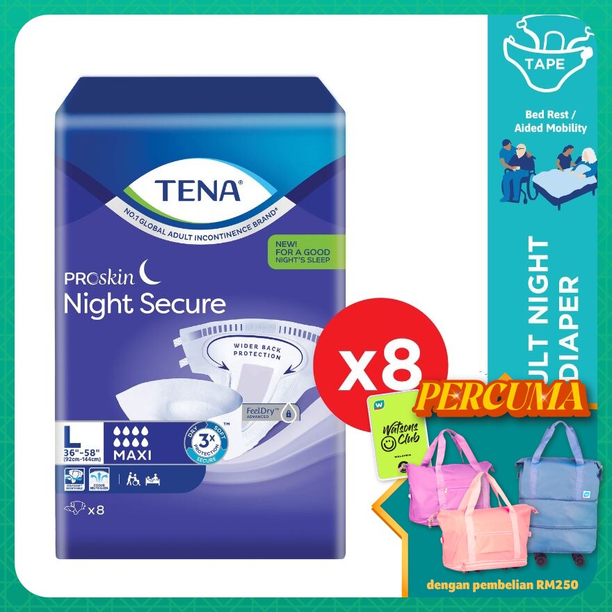 TENA ProSkin Night Secure is soft and comfortable night incontinence underwear with a pullup fit just like regular underwear. Designed with absorbency in the back where its needed most when lying down and an absorbent double core with leakage barriers, it offers leakage security throughout the night. Enjoy a better night sleep with TENA ProSkin Night Secure.