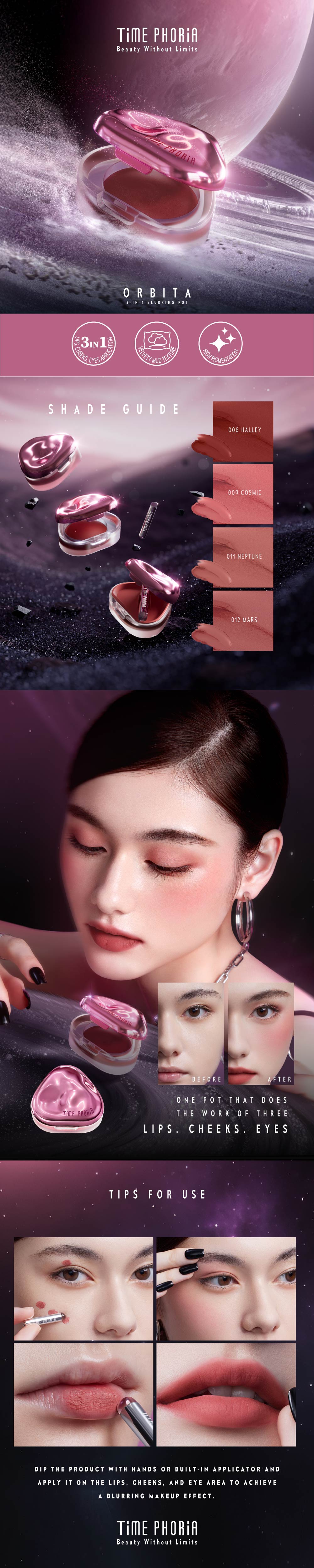 "One pot limitless applications Fluffy velvety mud texture High pigment color Touchless makeup ( Have built-in silicone applicator )"