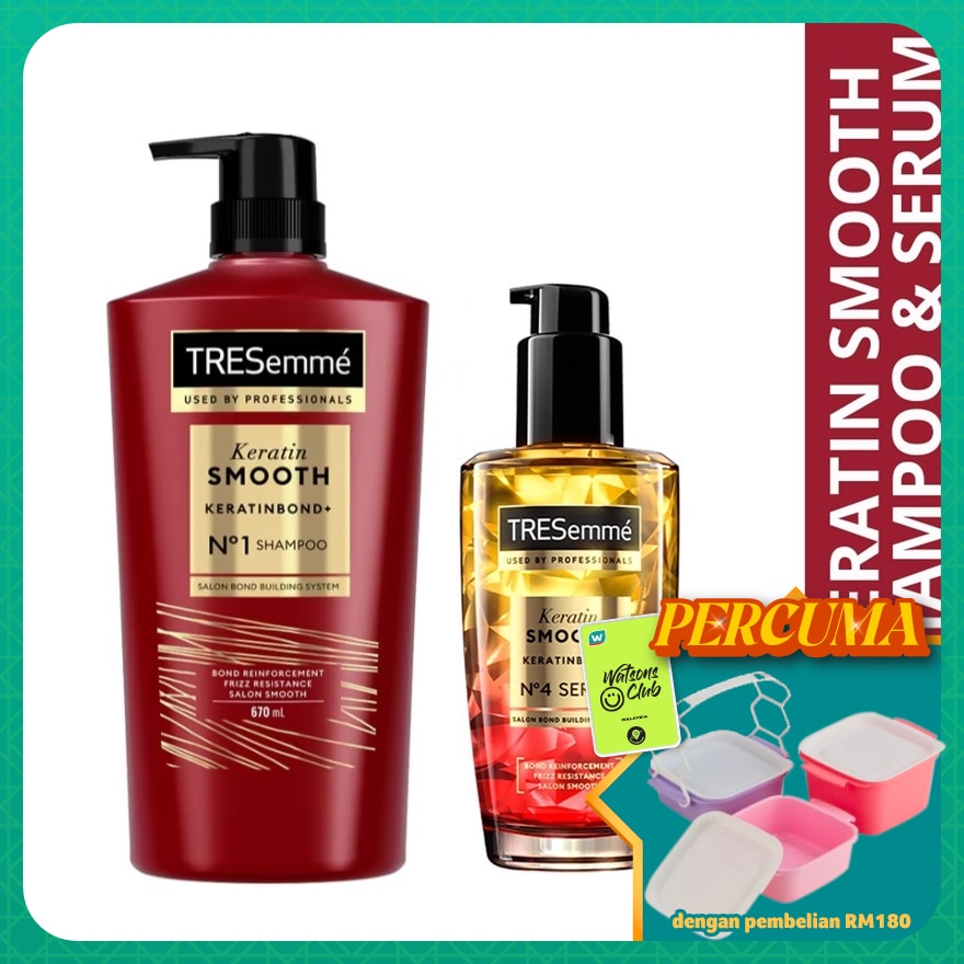"TRESEMME SHP KERATIN SMH 670ML - Promote a reduced usage of virgin materials by using recycled content insteadBottle is made with 25% post recycled content TRESemme brings backstage professional expertise at your fingertips. For runway standard beautiful hair everyday. TRESemme- Professional, Everyday. Specially formulated with Argan Oil and Keratin, TRESemme Keratin Smooth shampoo deeply cleanses and nourishes hair to give you 5 benefits in just 1 wash: anti-frizz, detangles, shines, smoothens, tames flyaways s. Suitable for colour treated hair. Use daily for runway standard smooth hair everyday. TRESEMME KRT SMTH SRM 100ML Tresemme Keratin Smooth Serum 100ml Bond Reinforcement Frizz Resistance Salon Smooth. SALON QUALITY, Tresemme Keratin Smooth Range infused with hydrolyzed keratin. Its advanced technology helps repair bonds broken by brushing, washing and even styling. It penetrates 10 layers of hair fiber with its non-greasy formula, and protects from damage due to styling. Based on lab test, with system use . OUR EXPERTS' TIP For hair as smooth and fluid as a salon keratin treatment, use the full Tresemme Keratin Smooth range. Disclaimer: Salon Bonding System refers to existing hair bonds."