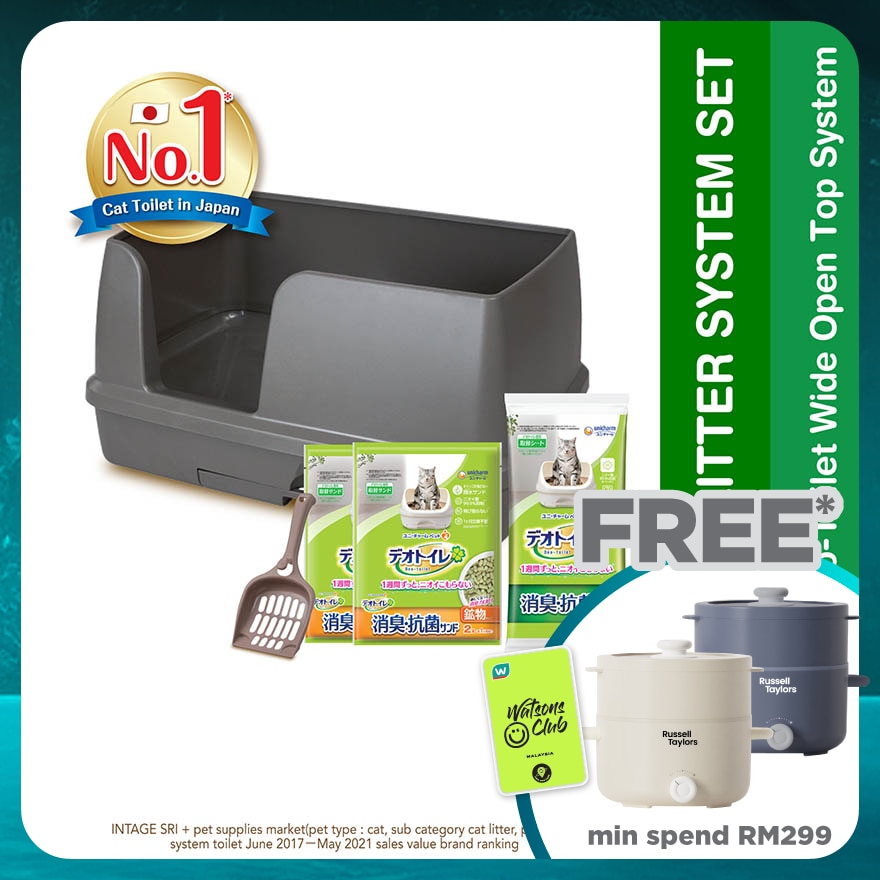 Deo Toilet Wide Open Top System set is inclusive of 1 wide cat litter box, 1 scooper, 2 bags of 2L zeolite pellet, 1 pack of 4S Deo-Toilet pad. Premium Range. Extra Wide Design for large cat & multiple cats household. Available in ivory & dark grey. Zeolite Pellet allow urine pass quickly & surface is always kept dry. Filter urine & remove odor. Does not stick to paws. Non clumping. 2L Zeolite pellet can last for 1 month. Absorbent Pad 99.9% Anti-Bac with Silver Ion (AG+) Tech to prevent urine smell. White surface for health monitoring. 1 Sheet can last for 7 Days.